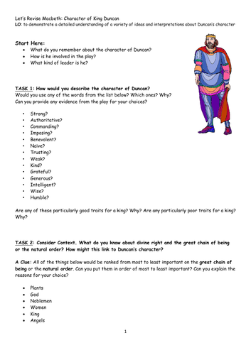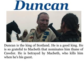 Examples of duncan being a generous kind and heartful king. Macbeth saved King Duncans kingdom from rebels and the Norwegian king. Duncan is the King of Scotland an old gracious pious and gentle man who resembles Lady Macbeths father in his sleep.